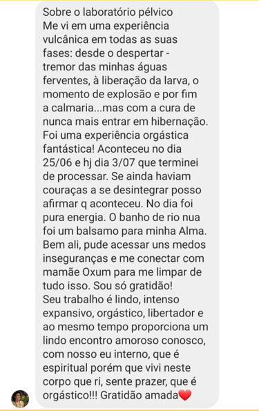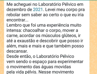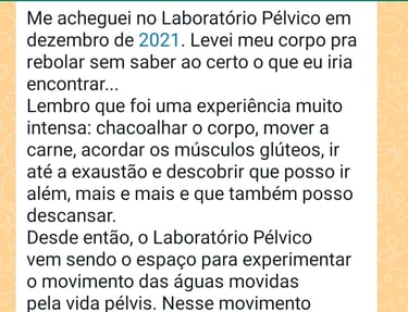 Durante más de 3 años, el Laboratorio Pélvico ha sido la niña de sus ojos (o su pelvis). Esta es una investigación en la que estoy involucrado hasta la médula. El Laboratorio ya realizó una gira por Brasil en sus talleres y fue invitado por varios festivales de sensibilización para formar parte de la programación. El Laboratorio es un SISTEMA y una constante investigación multidisciplinaria encaminada a redescubrir, acceder y elevar la Energía Vital a través de los movimientos de este gran caldero alquímico que contiene la Energía Primordial: la cadera.